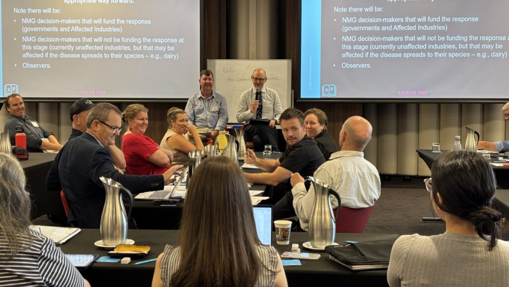 - Facilitated by AHA’s Ben Byrne and Dr Peter Dagg (Eastern Animal Health Professionals), the training exercise had participants thinking on their feet and confronting the reality of considerations during an NMG meeting.